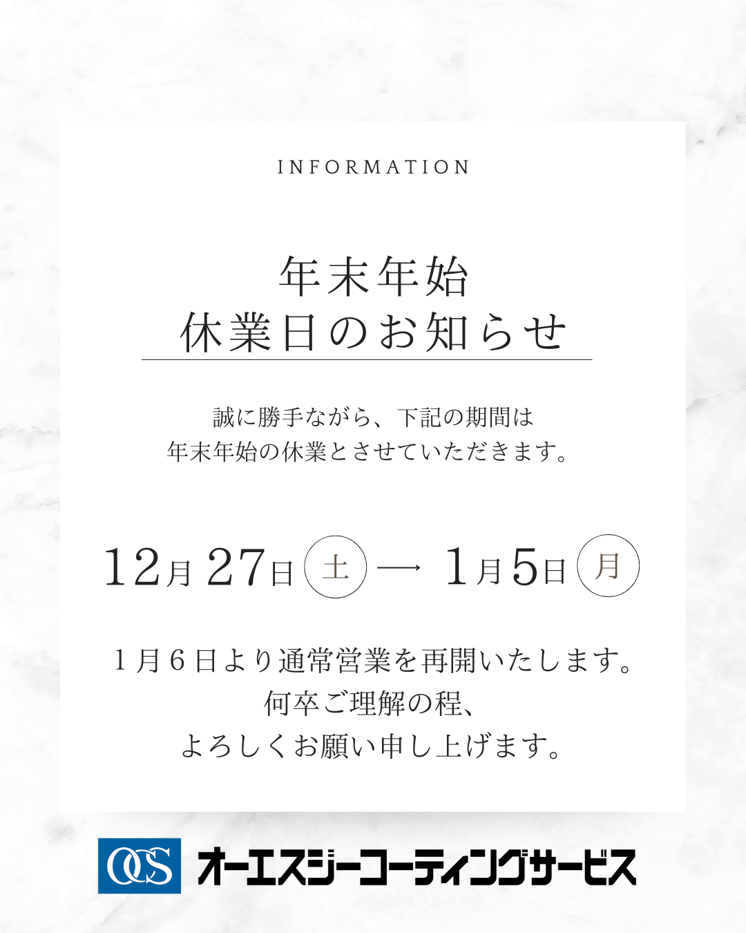 2025.12.02 年末年始休業のお知らせ 年末年始休業のお知らせ 平素より格別のご愛顧を賜り、誠にありがとうございます。 誠に勝手ながら、弊社は下記の期間を年末年始休業とさせていただきます。 休業期間 2025年12月27日(土)~2026年1月5日(月) 休業期間中にいただいたお問い合わせにつきましては、2026年1月6日(火)以降、順次対応させていただきます。 ご不便をおかけいたしますが、何卒ご理解賜りますようお願い申し上げます。